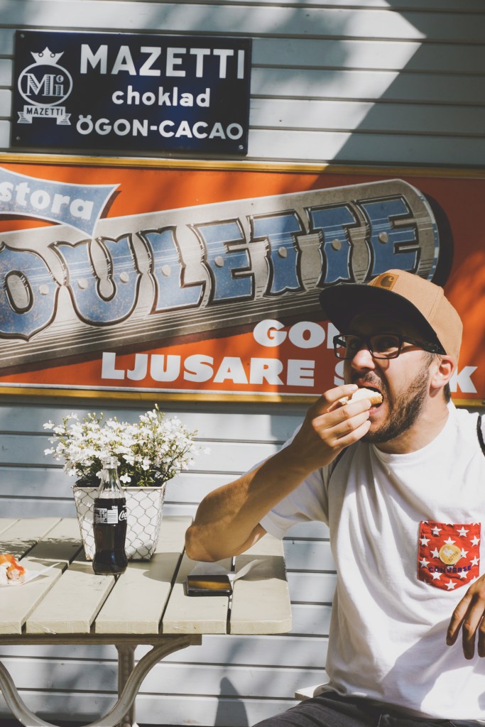 Da die Erklärungen auf dem Gelände leider ausschlielich in Schwedisch sind, schließen wir uns einer Führung durch das Jamtliland an. Es werden uns jedoch keine Jahreszahlen und historischen Ereignisse vermittelt, stattdessen unterhält sich unsere Gruppenführerin mit den Dorfbewohnern. Wir treffen einen Bewohner bei Trocken-Schwimmübungen an Land an, bekommen eine Einweisung bei unserem ersten Auto ohne Sicherheitsgurte für den Notfall, ein Elch würde die Straße betreten und wählen Tapete mit einer Bewohnerin aus den 70er Jahren aus. Die Tour macht hungrig und das einzige Nahrungsmittel am Kiosk sind Hot Dogs – Ikea verkauft Hot Dogs nicht nur, weil die günstig im Einkauf sind – die Schweden stehen einfach auf Hot Dogs.