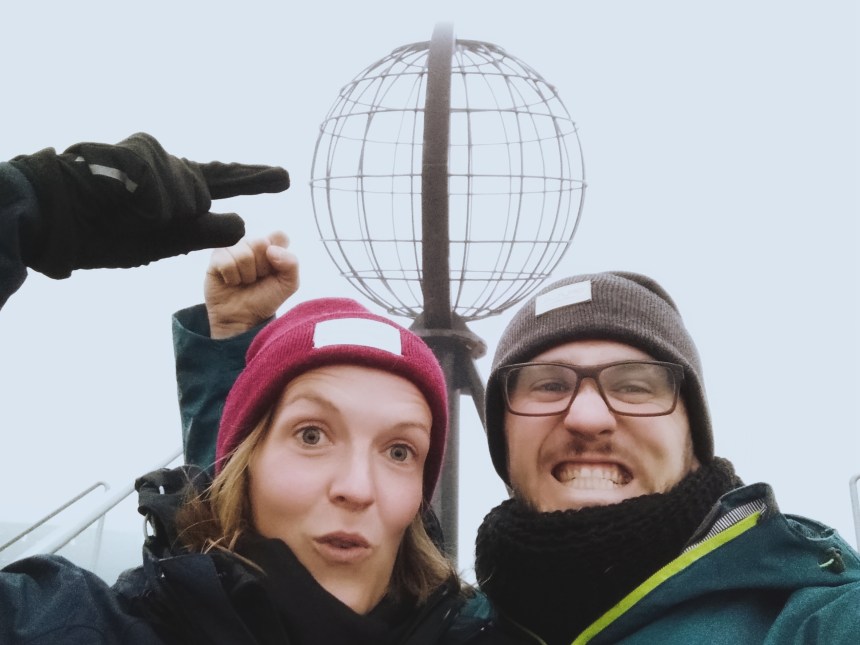 Da am Nordkap täglich Kreuzfahrtschiffe entleert werden und Busladungen von Touristen ausgekippt werden, entschlossen wir uns das Kap nachts zu erkunden. Dunkel wird es schließlich seit zwei Wochen nicht mehr wirklich. Wir verbrachten einen entspannten Tag an einem abgelegenen Rastplatz, etwa 130 km vom Nordkap entfernt, um gegen 23 Uhr aufzubrechen. Das Nordkap selbst ist tatsächlich ein Erlebnis, primär aber sicherlich symbolischer Natur als wenn der Ort malerisch schön wäre. Eventuell ist er es auch, wir trafen gegen 2 Uhr bei dichtem Nebel ein. Die 50 Busse auf dem Parkplatz bestätigten unsere Entscheidung für diesen nächtlichen Ausflug. Das Nordkap wird mit einem großen Globus skizziert, den wir durch die frühe Zeit für uns allein hatten. Für 10 Minuten waren wir tatsächlich die nördlichen Menschen auf Europas Festland.