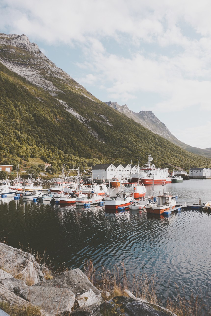 Nach diesem Tag ist uns nicht mehr nach Großstadttrubel und so streichen wir unseren geplanten Besuch in Tromsö und fahren direkt weiter nach Senja. Die Insel, die auf vielen Reiseblogs als Geheimtipp gehandelt wird, war schon vor Abfahrt ein festes Ziel. Die kleine Insel soll alle Facetten von Norwegen auf knappen 1600 Quadratkilometern vereinen. Nach 3,5 Stunden Fahrt erreich wir Senja spät abends. Heute wollen wir endlich mal wieder am Meer übernachten. Wir wählen einen Parkplatz an einer Fjordspitze und werden mit klarem Himmel, Mitternachtssonne und dem wahrscheinlich beeindruckendsten Gipfel auf der ganzen Insel begrüßt. Der Gipfel Segla ist 640 Meter hoch und sieht von unserer Perspektive aus, wie ein fast perfektes Dreieck in der Gebirgslandschaft. Zusammen mit dem Licht- und Schattenspiel, die die Mitternachtssonne auf das Gebirge fallen lässt, entsteht ein wirklich einzigartiges Bild. Ein toller Reisemoment.