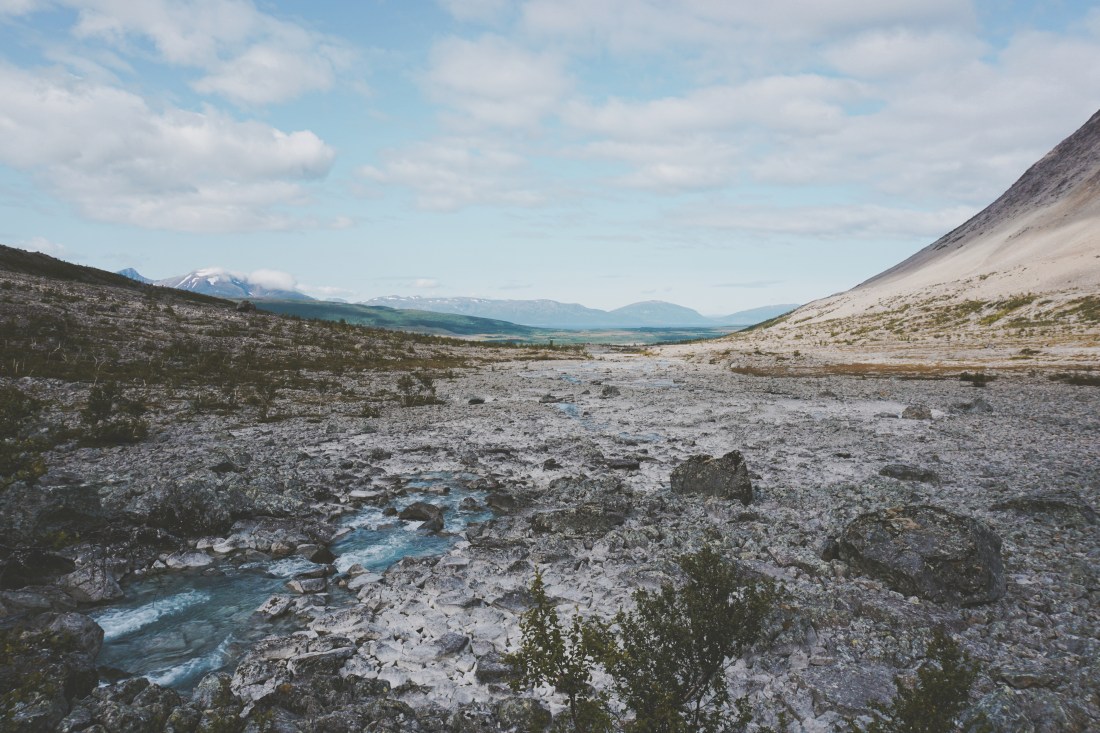 Am Morgen der Wanderung zum Blaisvatnet macht sich Unmut breit. Es sind nur 4km bis zum See. Wir hatten auf einen Tag in den Bergen gehofft. Nach etwa einem Kilometer ändert sich der Wanderweg schlagartig. Der Waldweg wird zu einem Meer aus Geröll, über welches bis zum See geklettert werden muss. Wir wandern offensichtlich das derzeit trockenliegende Flussbett hinauf.