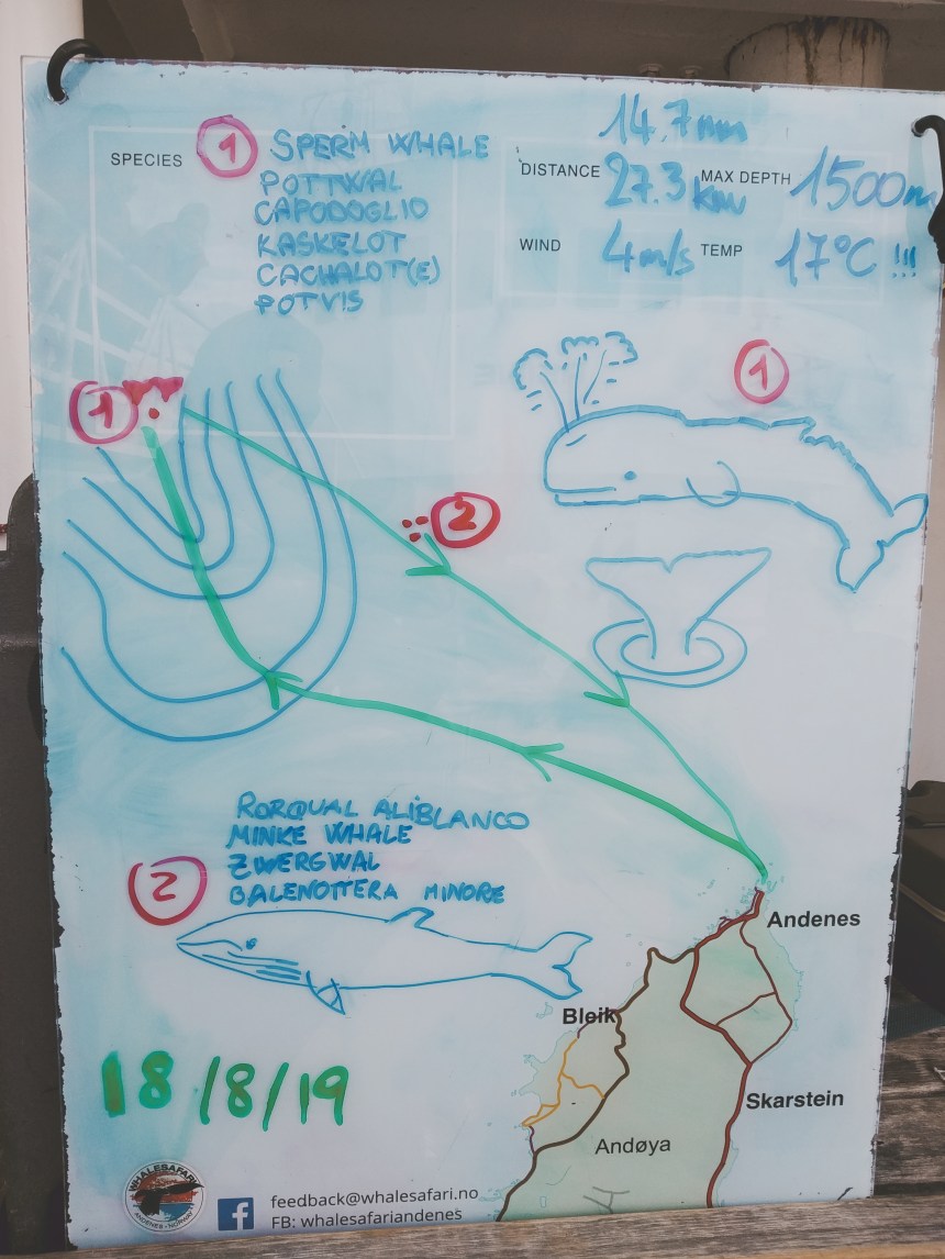 Als sich die Türen des Haupteingangs am nächsten Morgen öffnen, begegnen uns die ersten Personen mit einem ausgehändigten Ticket. Dominik hat Grund zur Freude, denn er wird wohl Wale sehen! Warum wir uns in diesem Moment schon so sicher sind? Das Wetter scheint hier der größere Risikofaktor zu sein. Fahren die Schiffe raus, ist die Wahrscheinlichkeit gering keine Wale zu sehen, denn etwa 10km vor Andenes trifft der Golfstrom auf dem Bleik-Canyon. Der Canyon vertieft das Meer von 300 m auf über 1500 m. Der Golfstrom schiebt die Nährstoffe aus der Tiefsee den Canyon hinauf an die Oberfläche. Perfekte Bedingungen für die Nahrung der Fische und Wale und für Menschen, die dieses beobachten möchten.