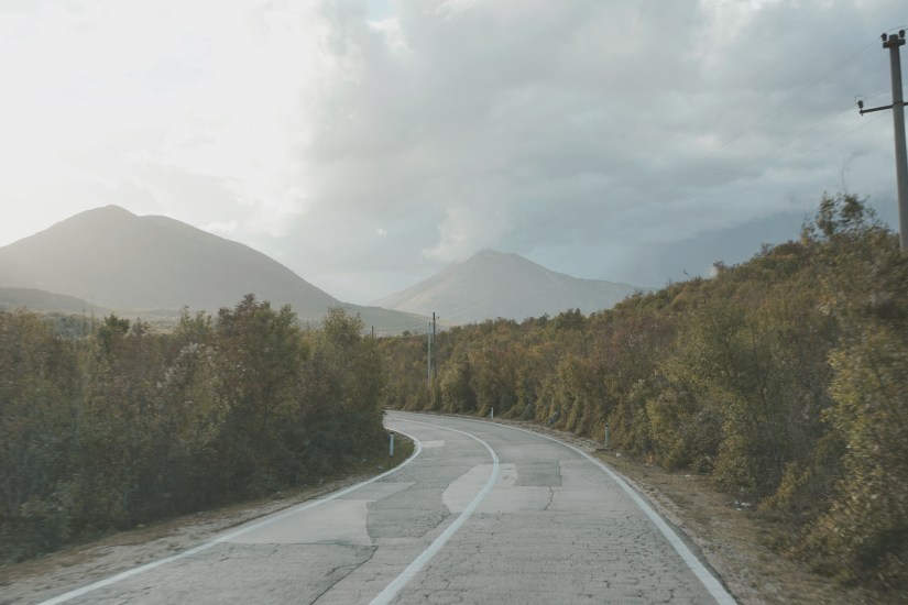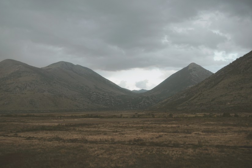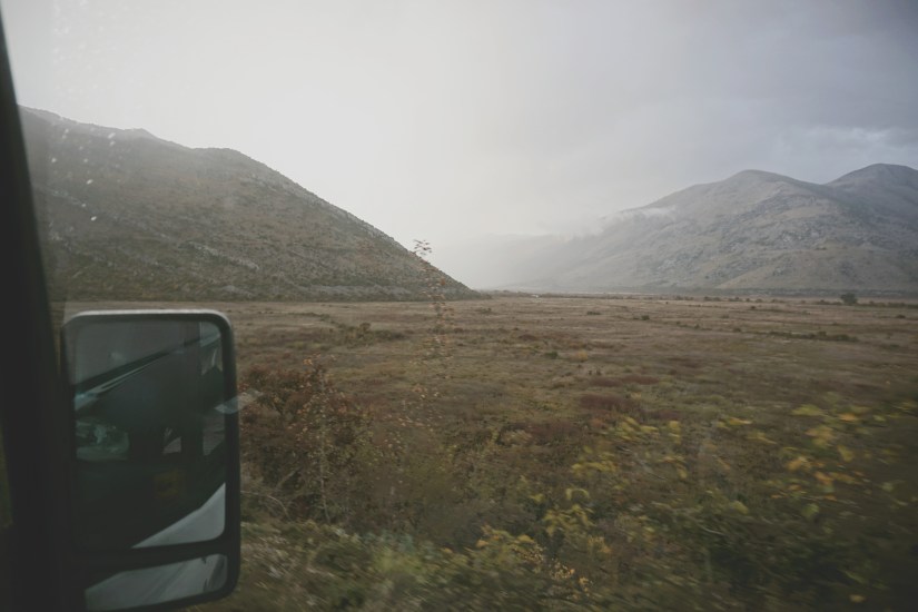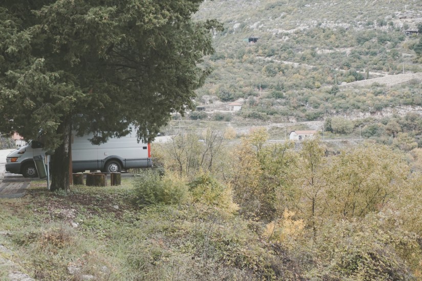Der Weg dorthin ist jedoch abenteuerlich. Seitdem wir die EU verlassen haben, treffen wir nun das erste Mal auf die von uns bis dato gefürchteten Straßenverhältnisse. Mit moderater Geschwindigkeit rumpelt Frieda Richtung Höhle durch die karge und verkarste Landschaft des Dinarischen Gebirges. In die Irre navigieren ist eine von Jasmins Königsdisziplinen, führt hier jedoch zu halsbrecherischen Wendemanövern und unzufriedenem Aufheulen von Friedas Motor. Belohnt werden wir dafür mit dem schönsten Schlafplatz seit Wochen. Der im Tal hängende Regen auf der einen Seite, die durchbrechende Sonne auf der anderen Seite sorgen für einen fantastischen Blick. Aber auch ohne dieses Naturschauspiel ist die Aussicht umwerfend.