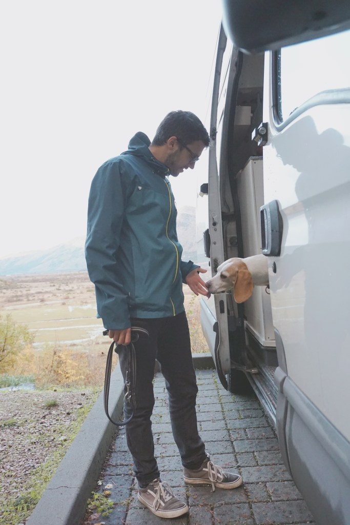 Nachdem Jasmin diesen Ort aus jeder erdenklichen Perspektive fotografiert hat, erkunden wir das kleine in den Hang gebaute Dorf. Es besteht aus gefühlten drei Straßen und einer Handvoll Wohnhäusern, einem Restaurant und der Höhle. Dementsprechend kurz ist unsere Erkundungstour. Wir liebäugeln mit dem Restaurant des Dorfes. Laut unserer Übernachtungsapp soll der Wirt einige Geschichten über den Ort erzählen können. Leider gibt es kein vegetarisches Gericht auf der Karte. Nach der Cevapcici Kur der letzten Tage, entscheiden wir uns für ein Abendessen in Frieda. Auf unserem Rückweg zum Bus, passt uns ein großer, sehr wacher Hund ab. Ein wirklich riesiger Zeitgenosse, gefärbt wie ein Wolf, aber so verspielt das er weder uns noch Juli auch nur für eine Sekunde in Panik versetzt. Dennoch bekommen wir direkt Hilfe aus dem Restaurant. Der Wirt schimpft mit dem Tier und schickt ihn fort. Keine Minute später ertönt aus der Ferne ein Rufen. Diesmal also kein Straßenhund, denn das scheint sein Besitzer zu sein. Aber Juli als Spielkameradin scheint viel verlockender. Sowohl Besitzer als auch Hund haben Durchhaltevermögen. 5 Minuten rufen, aber unveränderte Situation. Wir wollen es dem Besitzer ein wenig erleichtern und steigen in unseren Van. Bevor der Hund jedoch abdreht und endlich nach Hause zurückkehrt, markiert er noch schnell Frieda am Hinterrad. Die kleine Sau!