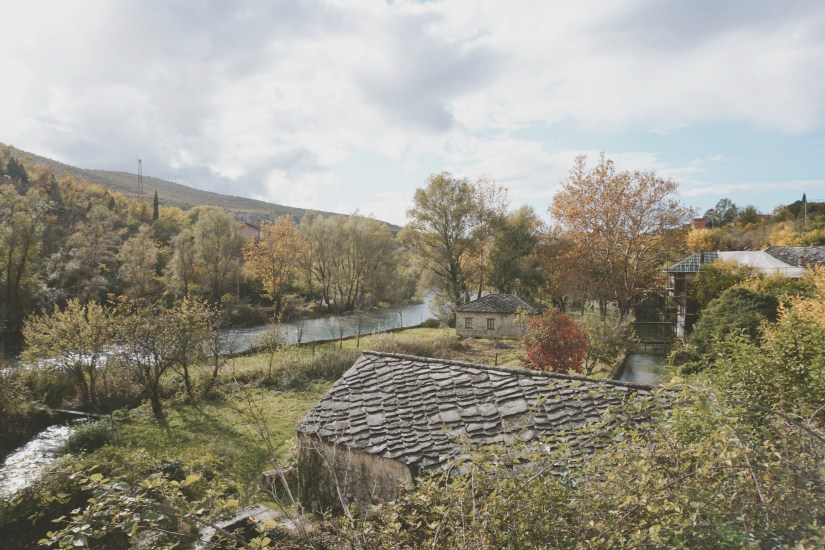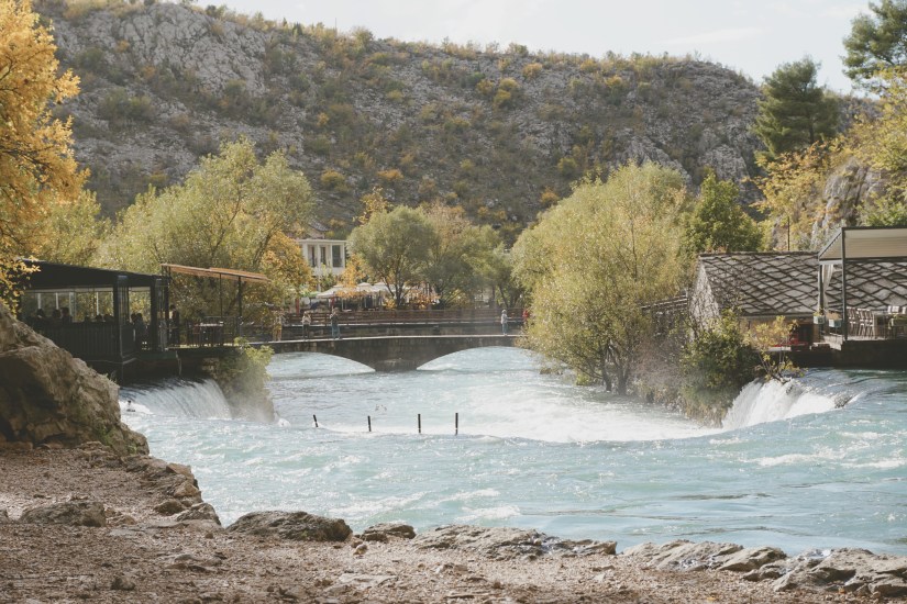 Der Parkplatz der Anlage kostet immerhin 7 KM umgerechnet 3,50 Euro. Der weitere Weg zur Anlage gleicht einer Allee, nur statt Bäumen wird der Weg von Souvenirständen gesäumt. Da Juli uns begleitet, können wir das Kloster nicht von Innen besichtigen und genießen so einfach nur den Anblick. Das Kloster ist etwa 600 Jahre alt, besonders beeindruckt jedoch die Lage. Errichtet wurde es direkt neben der Buna-Quelle, umgeben von Karststeinklippen. Die hohen Felswände sorgten damals für ausreichend Schutz. Es war also ein perfekter Rückzugsort für die so genannten Sufi, die Anhänger der dort beheimaten muslimisch-asketischen Bruderschaft. Auf der anderen Seite der Klippen sprudelt das kristallklare Wasser der Buna-Quelle aus dem Kalkstein. Mit Sage und Schreibe 43.000 Litern Wasser pro Sekunde, ist dies die größte Quelle Bosniens und eine der Größten in Europa.