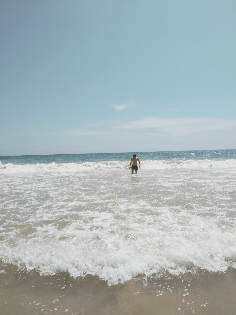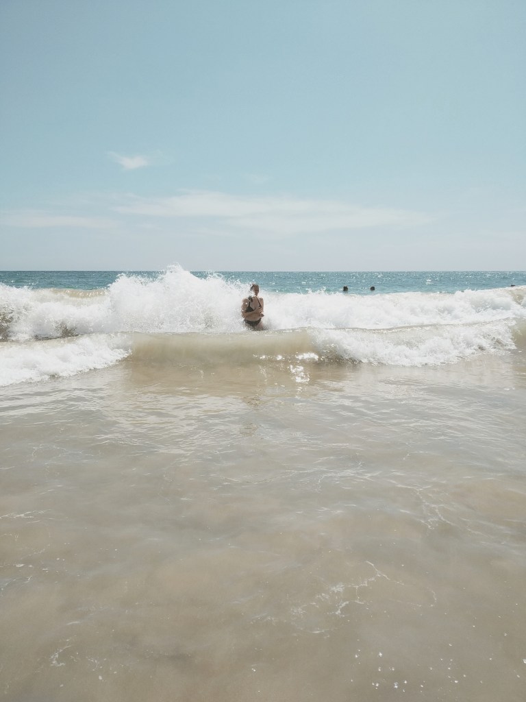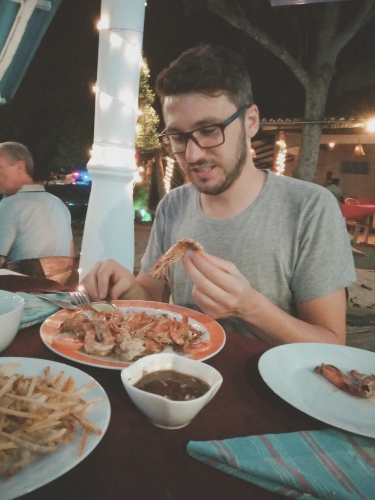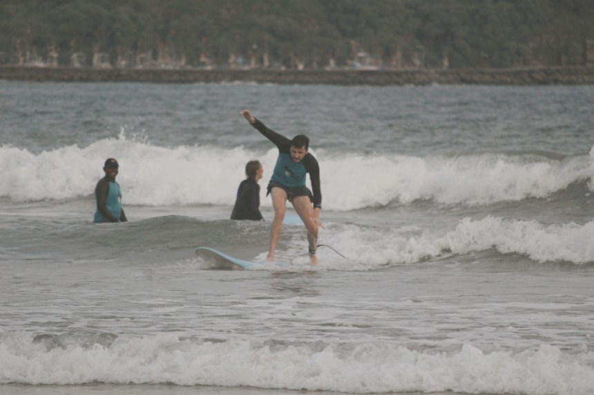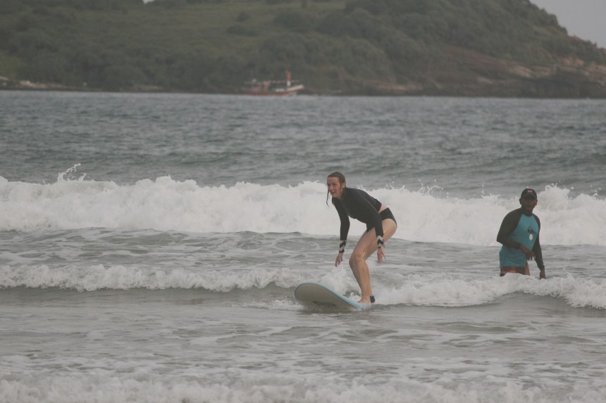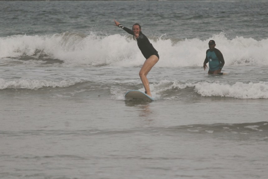 Die erste Nacht ist heiß. Als wäre das nicht anstrengend genug. Versammeln sich die Mücken unter unserem Mückennetz. Wie in einem schlechten Science-Fiction Film, scheinen sich die Tiere zu verdoppeln, sobald wir eines erledigt haben. Jede Stunde werden wir aufs Neue wach und finden mindestens 10 neue Mücken unter unserem Mückennetz. Jasmin sieht schon aus wie ein Streuselkuchen. Es hilft nichts, wir müssen in Anti-Mücken-Spray baden. Die wenigen Stunden Schlaf sind nicht die besten Vorrausetzungen für unsere erste Surfstunde am nächsten Nachmittag. Auf einer Weltreise hat man viele Möglichkeiten sich Kindheitsträume zu erfüllen. Bei Jasmin war einer davon das Wellenreiten.
