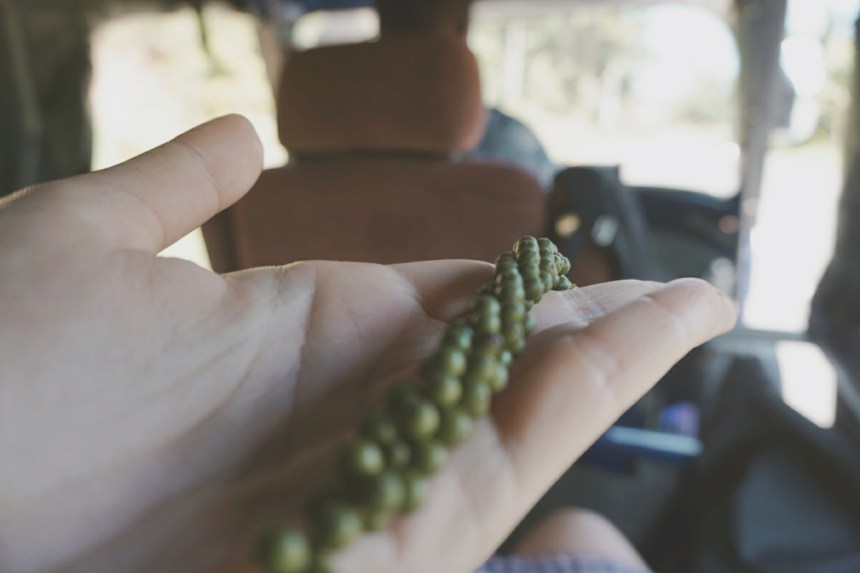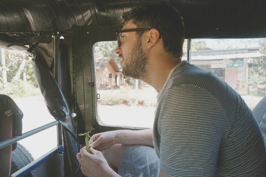 Dann verlassen wir Tangalle und rollen weiter Richtung Innenland, vorbei an Reisfeldern, im Hintergrund die Palmen. Der Fahrtwind weht uns um die Nase, es ist unfassbar schön. Wieder hält der Fahrer ohne ein Wort an und steigt aus. Wir halten die Luft an. Was nun? Er greift nach einem Blatt, zerreibt es und reicht es uns. „Aloe Vera!“ Es riecht gut. Wir strahlen. Er sieht unsere Begeisterung und greift nach dem nächsten Blatt. Eine Art Zitronengras, das als natürlicher Mückenschutz dient und unfassbar gut duftet. Von hier an wird die TukTuk Fahrt ein Erlebnis für die Sinne. Wir Schnuppern an Zimt und den Curry Blättern. Wir lernen einiges über die lokalen Früchte. Wir probieren grünen Pfeffer und bekommen eine Blüte gereicht. Der Fahrer schmunzelt: „Jasmin“. Der oft chemisch nachgeahmte Duft von Jasmin wird dieser Blüte nicht gerecht. Sie duftet herrlich. Hat Jasmin oft und gerne eine Anekdote aus ihrer Kindheit erzählt, bei der sie im Schulunterricht die Herkunft ihres Namens untersuchen sollte und nichts weiter als „Zierstrauch“ im Namensbuch zu finden war, wohingegen andere Kinder Namen mit Bedeutungen, wie die „Weise Kriegerin“ oder ähnliches aufwarten konnten, gibt es nun ein neues Ende für diese Geschichte. Stolz erzählt der Fahrer nämlich, dass Jasmin auf Sri Lanka als Gabe an Buddha gereicht wird.