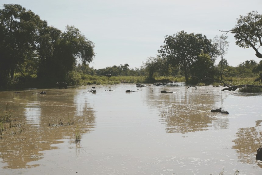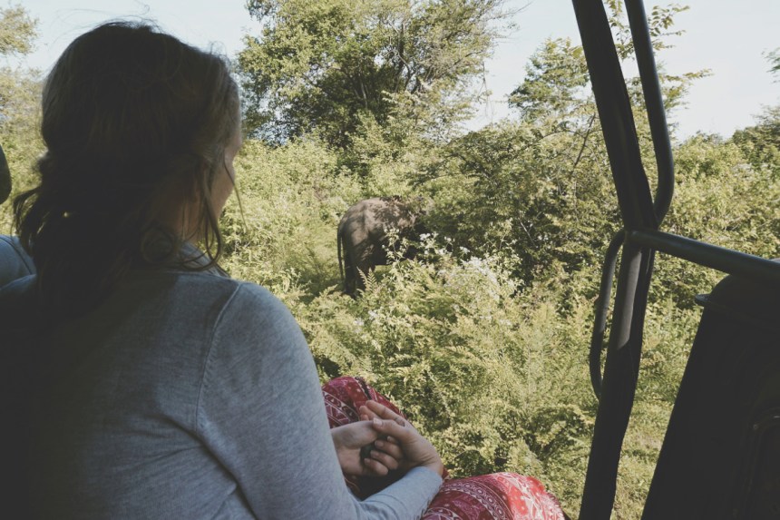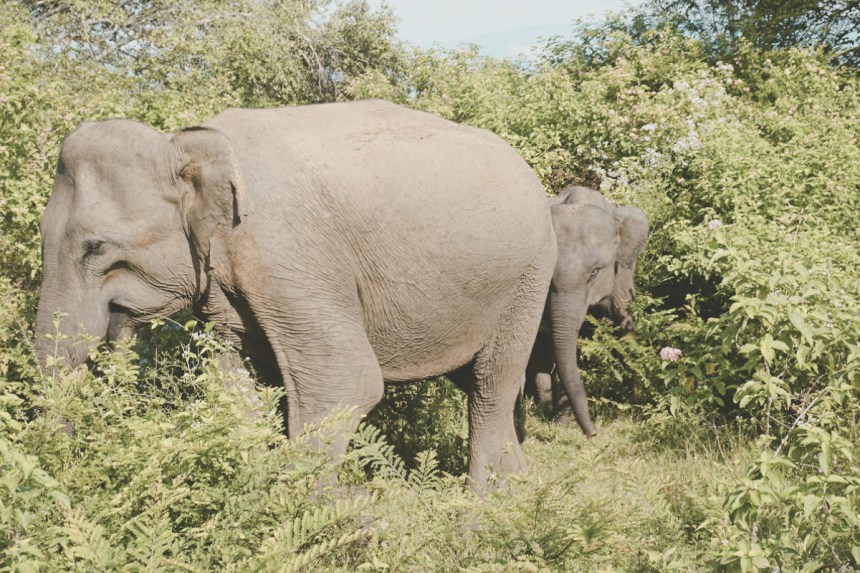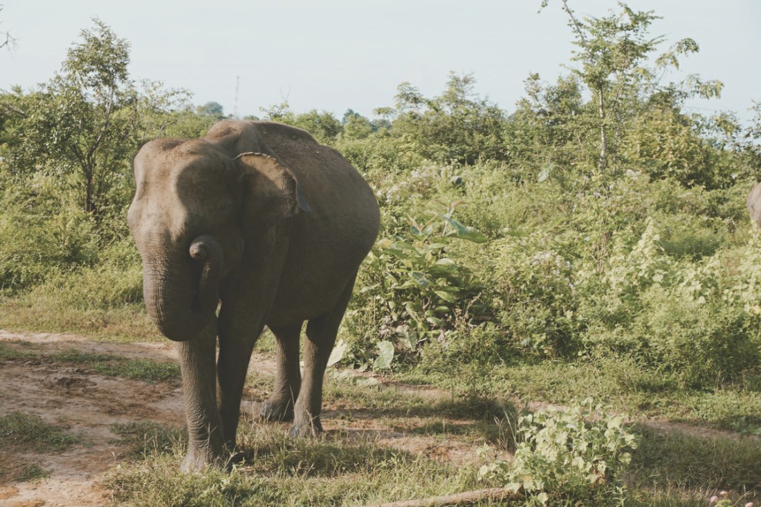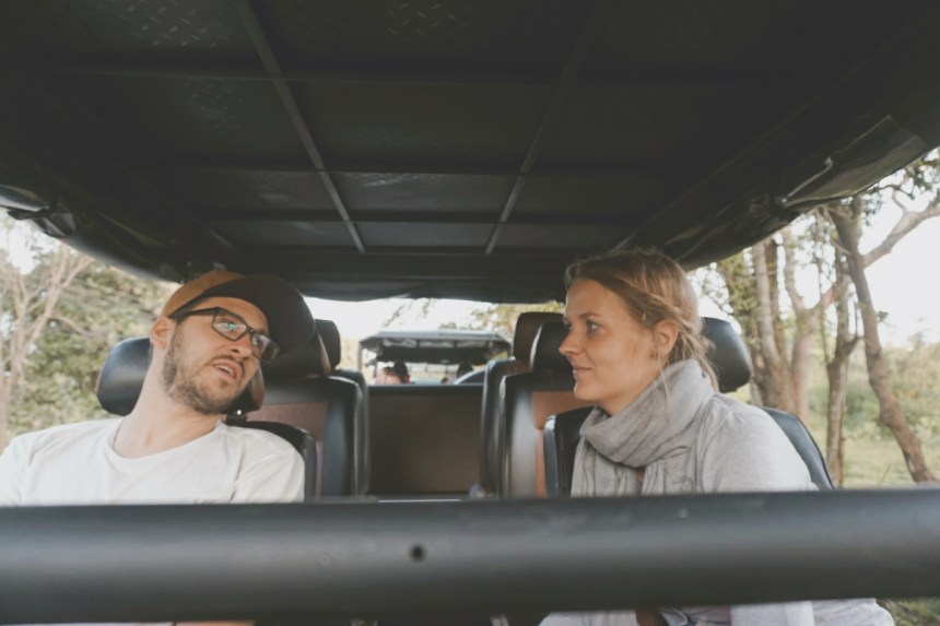 Die ersten Meter im Park bleiben ein wenig grotesk. Die Jeeps scheinen ihre Route bereits zu kennen, wir fahren die Runde immerhin in die gegengesetzte Richtung. Ein Gedränge auf Höhe der ersten kleinen Elefanten Familie gibt es dennoch. Je länger wir fahren, desto weniger Autos werden wir zum Glück, auch an das Geschaukel und Gerüttel scheinen wir uns langsam zu gewöhnen. Wirklich allein fühlen wir uns leider nie. Pfauen, Adler, verschiedene Vögel, Warane, Krokodile, Wasserbüffel, Chamäleons und natürlich Elefanten sehen wir auf unserer Tour. Langsam verdient sich unser Guide sein Trinkgeld, die Chamäleons hätten wir wohl ohne ihn genauso wenig entdeckt wie die Krokodile, die gerade mal mit ihren Augen über der Wasseroberfläche treiben, aber auch genauso gut Treibholz sein könnte. Zusätzliche Informationen sind nur schwer zu erhalten. Hinweise wie „weiblicher Elefant“, „Babyelefant“ etc. sind irgendwie auch für uns offensichtlich. Er redet gerne und so ist nicht nur das Genießen der Wildnis schwer möglich, sondern auch jedes Video am, das wir drehen, Ende mit seiner Stimme unterlegt. Ganz hilfreich ist seine Kommunikation mit unserem Fahrer, denn so halten wir an den Spots immer passend, sodass aus unserem Blickwinkel alles ersichtlich ist. Schönster Moment der Tour ist die besondere Begegnung mit einer kleinen Elefantenfamilie. Ein Jungtier kommt unserem Fahrzeug so dicht, dass der Rüssel nach unserer Hand zu greifen scheint. Wir halten den Atem an. Ähnlich wie Juli mit ihrer Pfote, reibt sich der Dickhäuter mit seinem Rüssel die schlaftrunkenen Augen. 06:00 Uhr ist offenbar auch für ihn zu früh. Auch das letzte Wasserloch unserer Tour ist irgendwie magisch. Eine Gruppe Wasserbüffel badet in diesem kleinen See, Vögel fliegen über die kleine Oase. Das bunte Treiben erinnert an eine Episode aus Abenteuer Wildnis. Wir sind mittendrin.