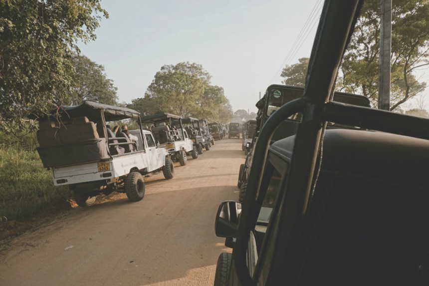 Die Schranken des Nationalparks öffnen bereits um 6 Uhr. Wir passieren die Schranke zum Park jedoch erst um 7:30 Uhr. Grund dafür ist nicht eine lange Anfahrt oder ein geringes Fahrttempo, es ist die Autoschlange vor dem Eingang. Bereits um 06:00 Uhr stehen unzählige Jeeps aufgereiht mit Touristen gefüllt vor den Toren. Sie variieren lediglich hinsichtlich ihres Zustandes zwischen deutlich mitgenommen und komfortabel gepolstert. Das Prinzip ist dabei immer gleich, auf alle Pick Ups wurde ein Aufsatz mit 6 Sitzen und einem Dach geschraubt. Glücklicherweise lassen die Ranger den Tieren zu Liebe immer nur kleine Gruppen am Stück hinein. So warten wir 90 Minuten, gut aufgereiht, bis wir das erste Tor passieren. Ein paar Meter weiter kommen alle Jeeps zum Stehen. Es folgt ein Massenstart im Sprinten. Die Türen gehen auf und die meisten der Fahrer stürzen los. Ein Fahrer vor uns ruft seinen Gästen, die genauso verwirrt schauen wie wir, beim Lossprinten noch zu „Ich kaufe Ihre Tickets.“ Auch unser Fahrer verlässt das Auto und begibt sich zügig Richtung Kasse. Und so hängen knapp 15 Jeeps schräg gekippt am Straßenrand und warten auf ihre Fahrer. Nach einigen Minuten sehen wir die ersten Zieleinläufe. Im Vollsprint kommen die Fahrer tatsächlich auch zurück, springen gekonnt in ihr Auto und brettern los. Unserer Fahrer hat es nicht ganz so eilig, er hat jemanden im Schlepptau. Ein Guide schließt sich uns an, angeblich ist alles inklusive. Naja, nicht so ganz wie er uns unmittelbar schon bei Fahrtbeginn zu verstehen gibt, bekommt er ein kleines Trinkgeld. Er schlägt uns selbst auch direkt vor in welcher Höhe das so angebracht wäre: 1000 Rupien, 2000 Rupien. Eine fremdbestimmte und vorab festgelegte Trinkgeldhöhe ist neu. Aber für sein schon in der Begrüßung offensichtliches schlechtes Englisch und den bis dato unbekannt guten Service planen wir natürlich gerne schon mal einen Bonus ein.