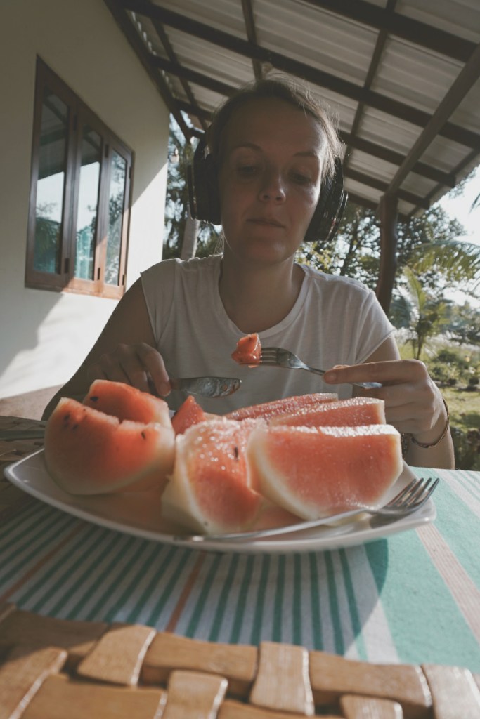 Da die Eltern unserer Gastgeber kaum Englisch sprechen, werden bei Nachfragen unsererseits sofort die Söhne angerufen, die für die Betreuung der Gäste zuständig sind, aber offensichtlich nicht auf dem Gelände wohnen. In den meisten Fällen springen sie dann ins Auto und sind nur wenige Minuten später bei uns. Während des Nachmittags haben wir es aber auch einmal ohne ihre Hilfe geschafft – irgendwie. Dominik drückt der Dame des Hauses eine Wassermelone in die Hand, die wir gerne aufgeschnitten hätten zum sofort essen und eine Cola für den Kühlschrank für das Abendessen. Zufrieden lächelnd dreht er sich um und läuft in Richtung Jasmin, die im Eingang wartet und nur aus dem Augenwinkel beobachten kann, wie die Mama sichtlich irritiert Cola und Melone in ihrer Hand anschaut und lacht. Das haben sie nicht verstanden! Und so warten wir knapp 20 Minuten bis klar ist, wir bekommen keine Wassermelone mehr. Entweder betrachten sie beides als Gastgeschenk und Dominik trifft sie gleich an, wie sie genüsslich die Wassermelone verzehren oder wir bekommen beides zum Abendessen, da sie nur das Wort „Dinner“ verstanden haben. Wohl eher Zweites. Als er in das Haus eintritt, fangen sie hektisch an die Wassermelone aufzuschneiden. Die Cola bekommen wir kalt am Abend, nur der Sohn fragt uns beim Tisch decken abends, ob das mit der Melone alles so richtig war. Offensichtlich herrschte hinter den Kulissen doch ein wenig Panik. Die Gastgeber übertreffen sich mit dem zweiten Dinner noch einmal bei Weitem. Zum Dank zahlen wir gerne etwas mehr. Wohnen im Dschungel war ein absolutes Erlebnis.