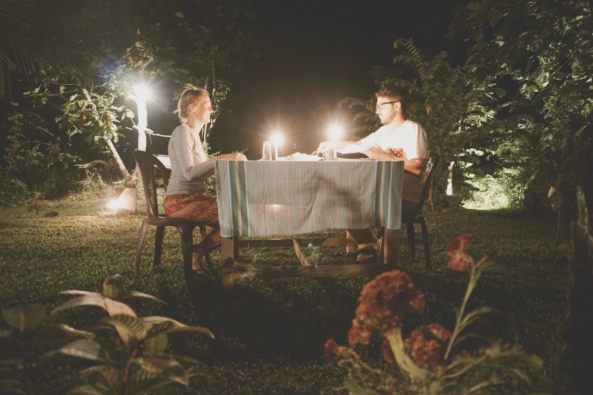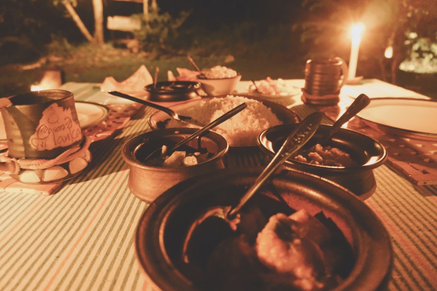 Die Enttäuschung über den verpassten Besuch im Transit Home hält nur bis zum Abendessen. Erneut testen wir die kulinarischen Fähigkeiten unserer Gastgeber, erneut gibt es Reis & Curry. Diesmal punktet vor allem das Ambiente. Als es dunkel wird, stellt unserer Gastgeber Petroleumlampen vor unserer Veranda auf, schaltet indirektes Licht im Dschungel an und stellt den Tisch auf die freie Fläche vor unserem Bungalow. Traumhaft. So schön haben wir noch nie gegessen. Und so genießen wir unter freiem Himmel das beste Dhal Curry unserer Reise, lassen das letzte Jahr passieren und schmieden Zukunftspläne.