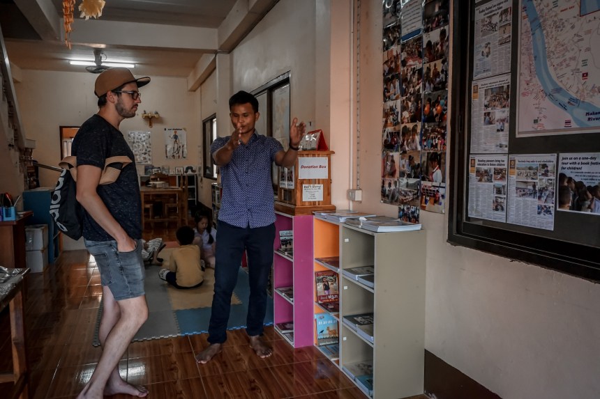 Wir schlendern weiter durchs Dorf. Viel gibt es hier nicht zu entdecken und als wir gerade umkehren wollen, sehen wir ein Schild, dass Reisende dazu einlädt den Dorfkindern Englisch beizubringen. Wir fragen den Leiter des Projektes Reading Elephant Laos, wie das ganze abläuft, sind begeistert und versprechen um 17:00 Uhr zurück zu sein. Vor den ersten Kindern erreichen wir die kleine Bibliothek erneut. Ihr Betreiber erzählt uns von seinem Projekt, das er mit einem Berliner gemeinsam betreibt. Er ist eigentlich Verleger für Kinderbücher und betreibt diese Bücherei, um Kinder beim Lesen zu unterstützen. Bücher sind hier Mangelware. In manchen Regionen schließen Kinder nur die Grundschule ab, gibt es zwar etwas wie Schulpflicht, müssen manche Kinder trotzdem die ganz kleinen Geschwister hüten, während die Eltern arbeiten. Wir freuen uns, dass auch wir etwas dazu beitragen können und spielen schon kurz darauf Mikado, lassen die Kinder Punkte zählen, zeichnen Bilder und benennen Tiere.
