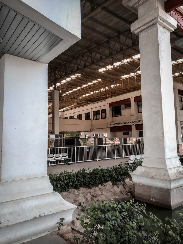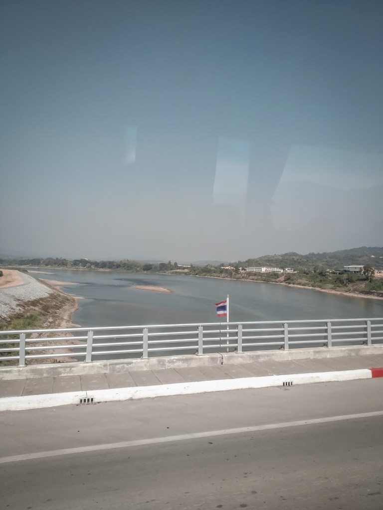 Über unsere Weiterfahrt nach Laos waren wir uns lange unklar. Bis nach Luang Prabang brauchen wir drei Tage über Land und Wasser, mit dem Flugzeug wären wir schneller. Am Ende siegt die Neugier zwei Tage auf dem Mekong zu schippern. Die Boote starten in Huayxai in Laos und so laufen wir nach zwei Nächten in Chiang Rai morgens zum Busbahnhof. Den Grenzübergang kann mit Hilfe einer Agentur organisieren oder einen auf Reiseblogs angepriesenen Bus nehmen, der einen über die komplette Grenze begleitet. Nach unserer Kalkulation ist es günstiger, wenn wir das selbst Stück für Stück organisieren und so wählen wir erst einmal einen Bus der uns bis zur Freundschaftsbrücke bringen soll. An dieser Stelle ist der Mekong die natürliche Grenze zwischen Thailand und Laos, mit dem Überqueren der Brücke, wechseln wir auch das Land.