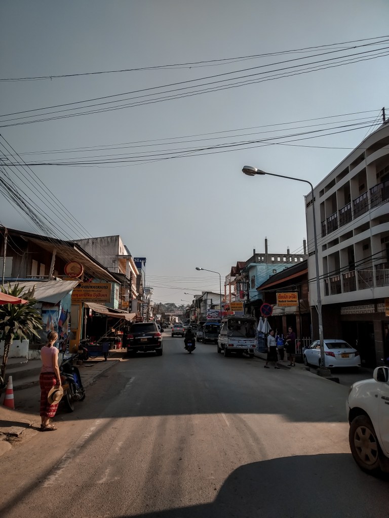 Nach der Grenze folgt die nächste Überraschung, natürlich benötigen wir ein TukTuk um nach Huayxai zu kommen. Das Sammel TukTuk startet aber erst bei fünf Fahrgästen. Der Grenzübergang war doch aufwendiger als erwartet, nach weiteren 15 Minuten kommen drei junge Asiaten, die auch in die Stadt wollen, kurz vor Abfahrt springt noch ein junger Einheimischer auf. Wir zeigen dem Fahrer ein Hostel, an dem er uns absetzen soll und dann geht es los. Schon nach wenigen Hundertmetern kollidieren wir fast mit einem LKW, penetrantes Hupen rettet uns. Der Wind weht uns um die Nase, wir sehen den Mekong und die ersten Häuser in Laos. Wir sind gespannt wo wir heute übernachten werden. Es gab nur wenige Unterkünfte, die online zu buchen waren, die Preise schienen uns der Leistung nicht entsprechend und so reisen wir völlig flexibel und buchen vor Ort.