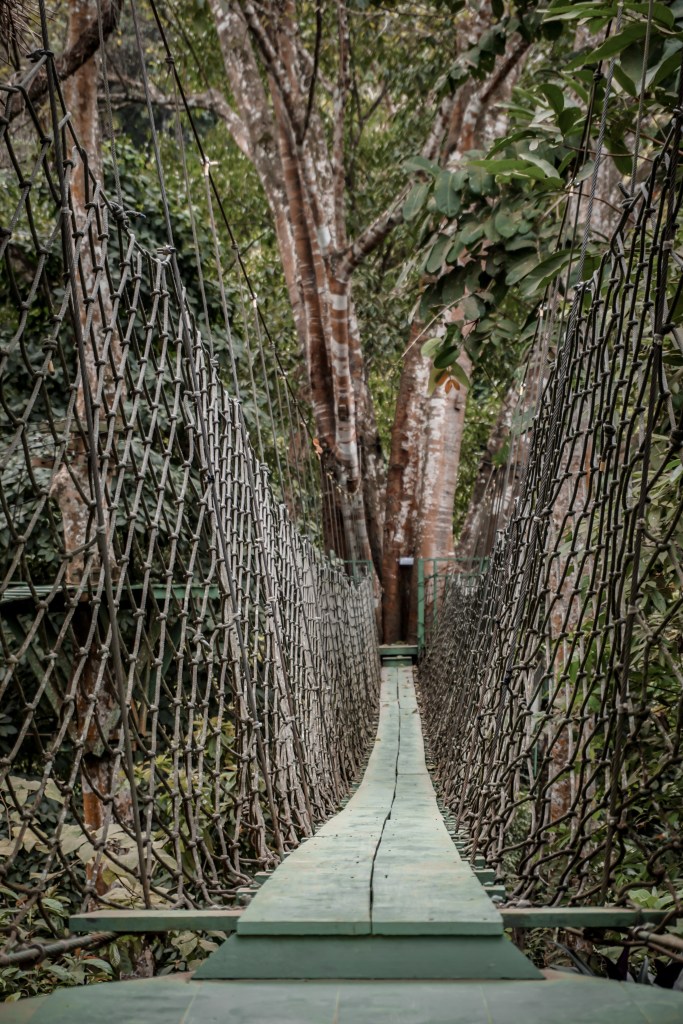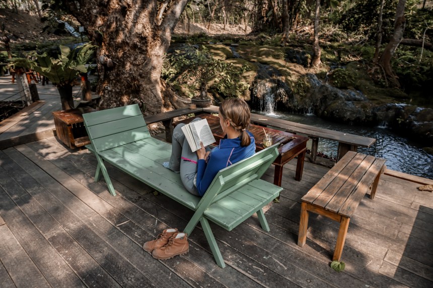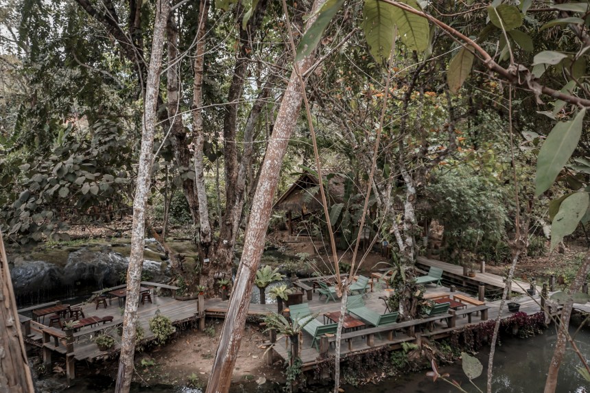 Der Eintritt ist günstig. Für einen Aufpreis kann eine Kochschule besucht, Traumfänger gebastelt, Zipline gefahren werden und einiges mehr. Wir wollen zunächst erst einmal das Gelände erkunden. Wir spazieren durch einen wunderschönen Garten, vorbei an einem idyllischen Restaurant, bis irgendwann hinter einem kleinen Wasserfall der laotische Dschungel die Oberhand gewinnt. Die Stille des Parks und die frische Brise laden förmlich zum Verweilen ein. Die Landschaft ist herrlich, so dass wir umherziehen, bis der Hunger kommt. Mit einem Buch bewaffnet entspannen wir im Restaurant, snacken dabei selbst angebaute Süßkartoffel-Pommes und hausgemachte Limonade. So lässt es sich leben.