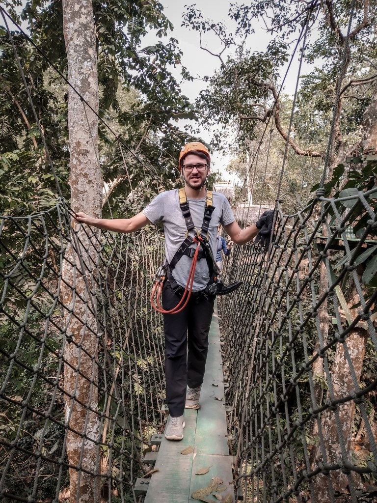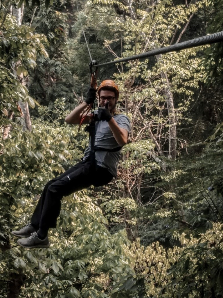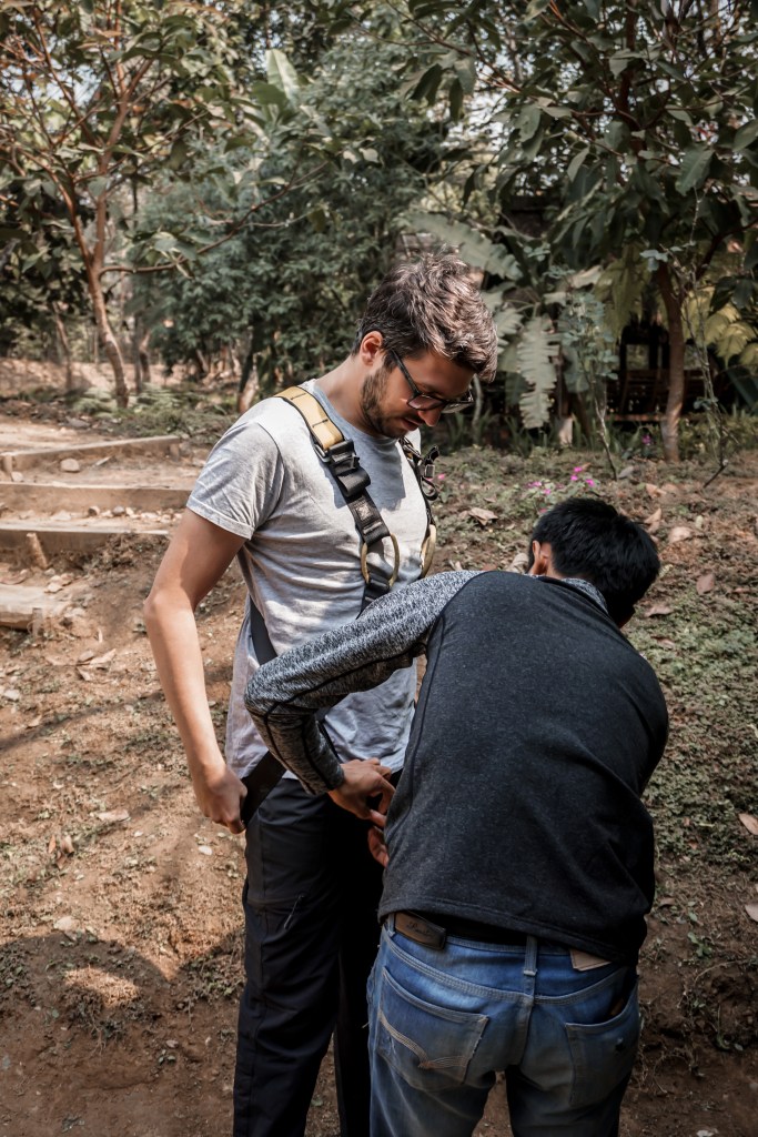 Nur Dominik wird nach einer Weile etwas unruhig. Der Rollertrip über die Buckelpiste war offensichtlich noch nicht aufregend genug. Stand er schon in Sri Lanka vor einer Zipline und hat sich geschworen das irgendwann auszuprobieren, ist jetzt die Gelegenheit. Der Parcours bietet sechs unterschiedlich lange Teilstücke, die teilweise durch die Baumgipfel und teilweise frei, mit großartiger Aussicht führen. Begleitet wird jede Gruppe von zwei Guides. Einer startet, der andere fährt hinterher. Letzterer spricht hervorragendes Englisch und erzählt, dass er aus einem der Dörfer unweit des Parkes stammt. Aus der Englischstunde bei den Reading Elephants wissen wir, dass gerade auf den Dörfern die Schulbildung nicht so stark verfolgt wird. Der Guide hat es sich selbst mit YouTube-Videos beigebracht. Wir wollen den Roller noch ein wenig nutzen. Jasmins Vorliebe für Eis führt uns eine knappe Stunde durch die Umgebung Luang Prabangs zu einer Büffelfarm – hier gibt es Büffeleis. Was für ein Highlight. Nach Monaten das erste Milcheis!