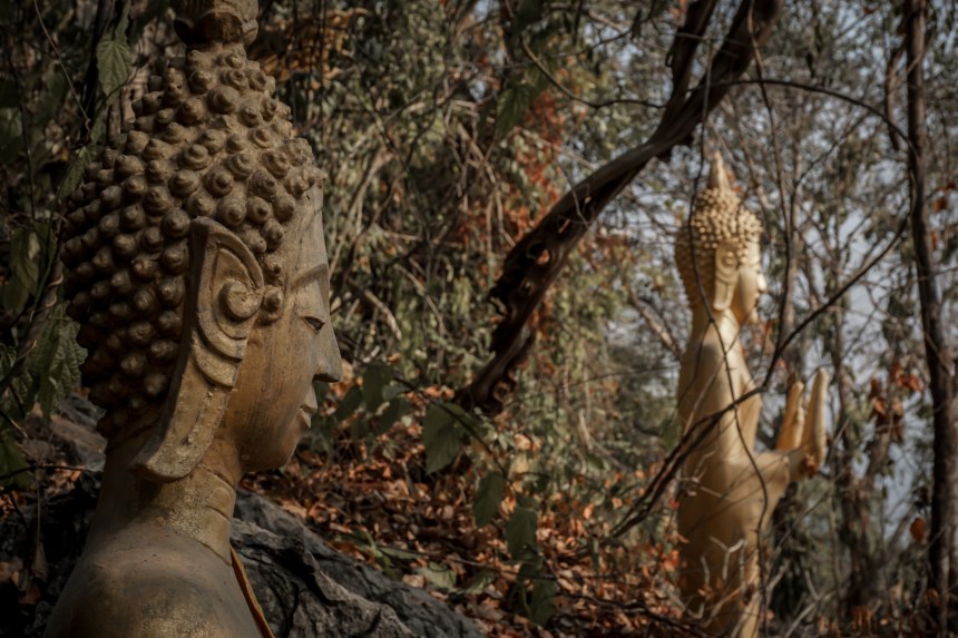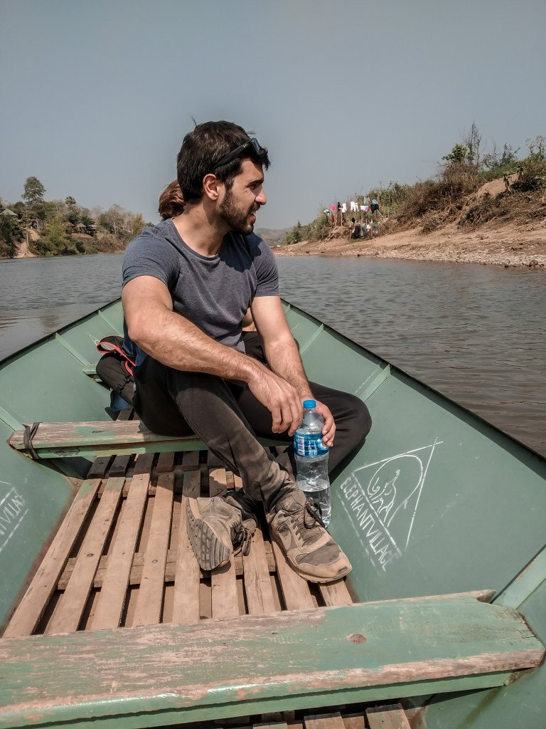 Irgendwann führt der Weg in eine Sackgasse. Wir erreichen erneut den Nam Kang. Wo der Weg endet unterhalten sich gerade ein Mönch und ein Fischer. Letzterer deutet unsere fragenden Gesichter richtig, wir wollen über den Fluss und sind hochgradig an einer Mitfahrgelegenheit interessiert. Er lacht, setzt uns in sein Boot, schmeißt den Moter an und bringt uns auf die gegenüberliegende Seite. Wir stecken ihm als Dankeschön ein paar Kip zu und folgen dem Weg wenige Meter. Bis es plötzlich knackt im Unterholz. Vor uns stehen tatsächlich Elefanten. Das Herz schlägt sofort höher, uns sind die Dickhäuter nicht geheuer, MapsMe führt uns gnadenlos an den Tieren vorbei. Erst auf den zweiten Blick entdecken wir, dass die Tiere in Ketten liegen. Na super, wir stehen in Mitten eines Elefantencamps. Wenige Meter später entdecken wir eine Dame. Schnell erklären wir, dass wir nur abgesetzt wurden und verschwinden, bevor sie auf die Idee kommt Eintritt zu verlangen. Derartige Organisationen wollen wir keineswegs unterstützen.