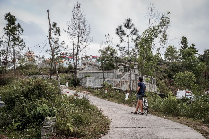 Haben wir gehofft zwischen Reisfeldern die ein oder andere Kaisergrabstätte zu finden, wird aus der Stadt eher ein Dorf. Freie Fläche ist jedoch nicht zu finden. Das einzige Grün entdecken wir bei einem Eco-Resort, wir halten, um uns mit Pommes und Früchten zu stärken. Den Weg weiter folgend erreichen wir zwar keine kaiserliche Grabstätte, dafür aber einen herkömmlichen Friedhof. Die Gräber reihen sich über die hügelige Landschaft, jedes ist ein in Stein gemeißeltes Kunstwerk. Der Wind pfeift mystisch drüber, irre. Den restlichen Nachmittag genießen wir bei liebgewonnenem Kokosnuss-Kaffee und Eisschokolade.